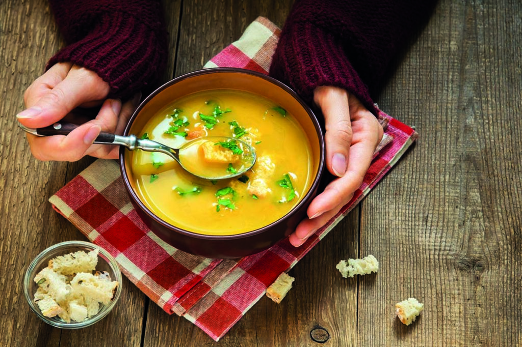 Zutaten für 4 Personen: ¾ l Hühnersuppe ¼ l Sauerrahm 1 El. Mehl glatt 2 El. Grünkernschrot mittelfein Salz, Pfeffer,...
