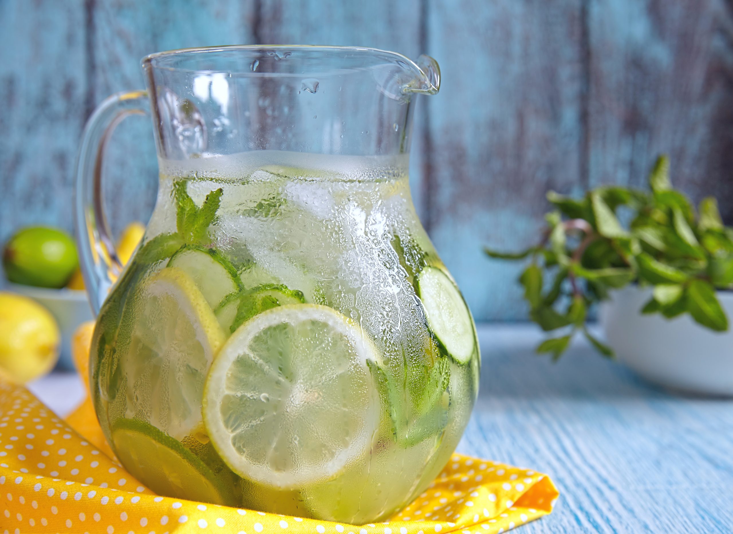 2. Labkraut, Gurke und Zitronenscheiben in einen Krug geben und mit Wasser auffüllen.